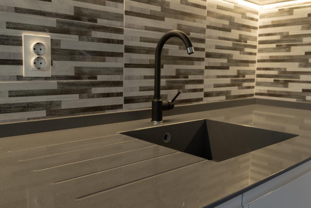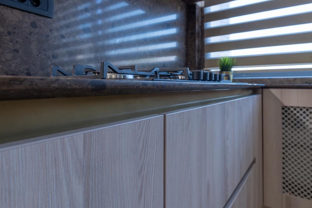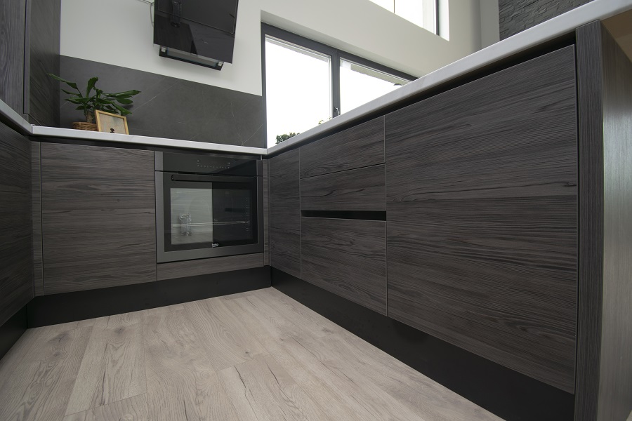 Blatul HPL compact este alegerea perfectă pentru durabilitate și rezistență în fața uzurii zilnice. De asemenea, acesta adaugă un aspect modern și curat, în timp ce plăcile laterale din același material oferă o continuitate vizuală și estetică în întreaga mobilă de bucătărie.