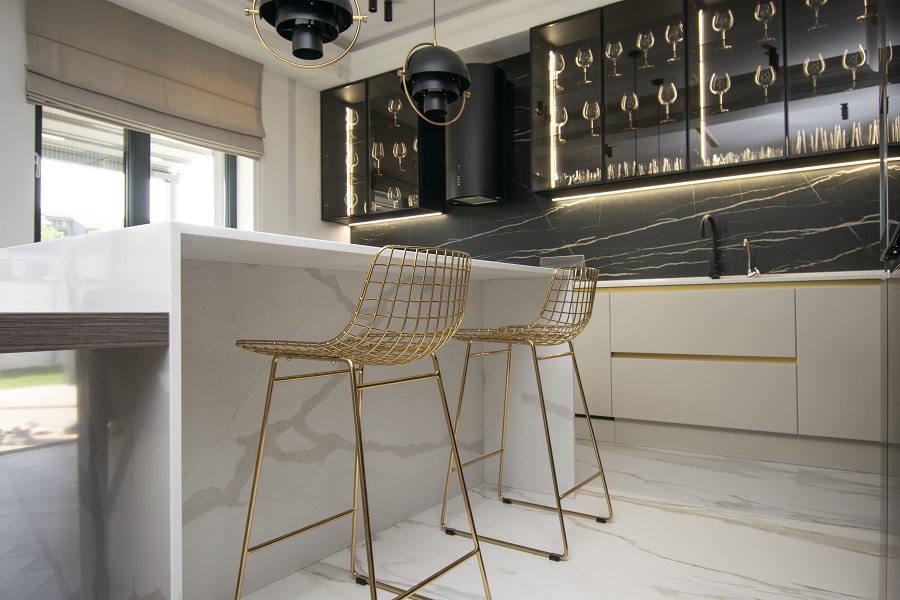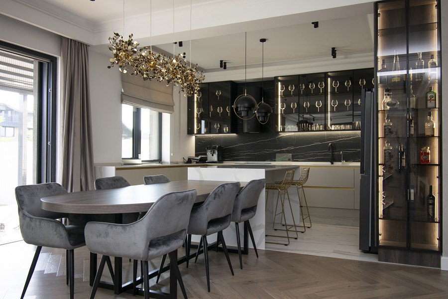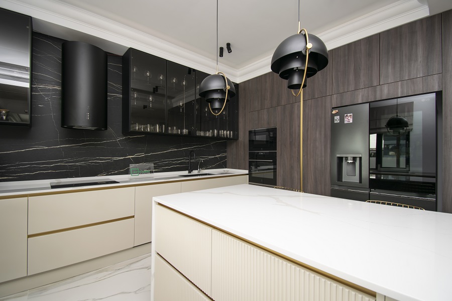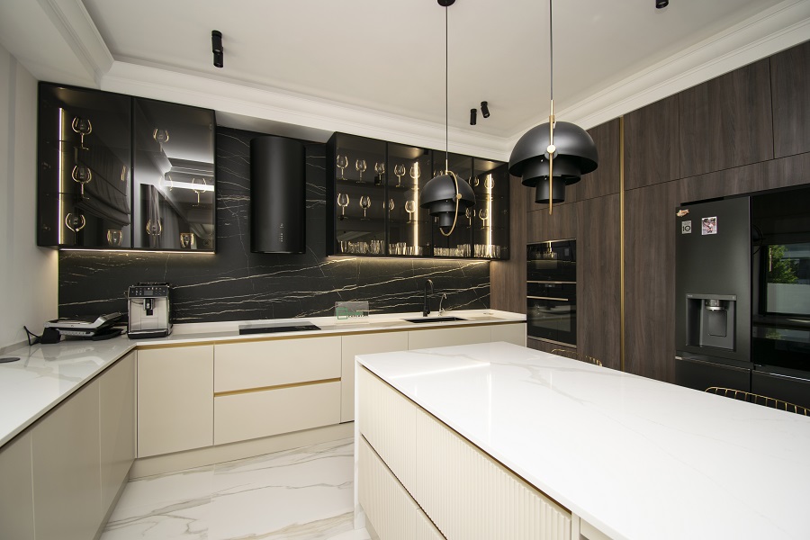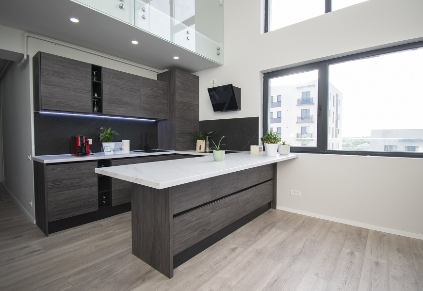 Insula cu blat și placări laterale din HPL compact adaugă un spațiu funcțional și practic în bucătăria ta. Aici vei putea găti, pregăti mese delicioase și socializa cu familia și prietenii, oferindu-le o experiență plăcută în bucătărie.
