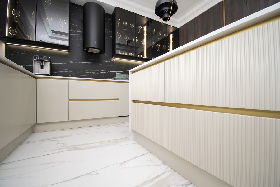 Corpurile suspendate cu fronturi MDF vopsite riflate adaugă un element suplimentar de design și rafinament. Această combinație ingenioasă între fronturile riflate și corpurile suspendate adaugă profunzime și textură în bucătăria ta, transformând-o într-un spațiu unic și plin de personalitate.