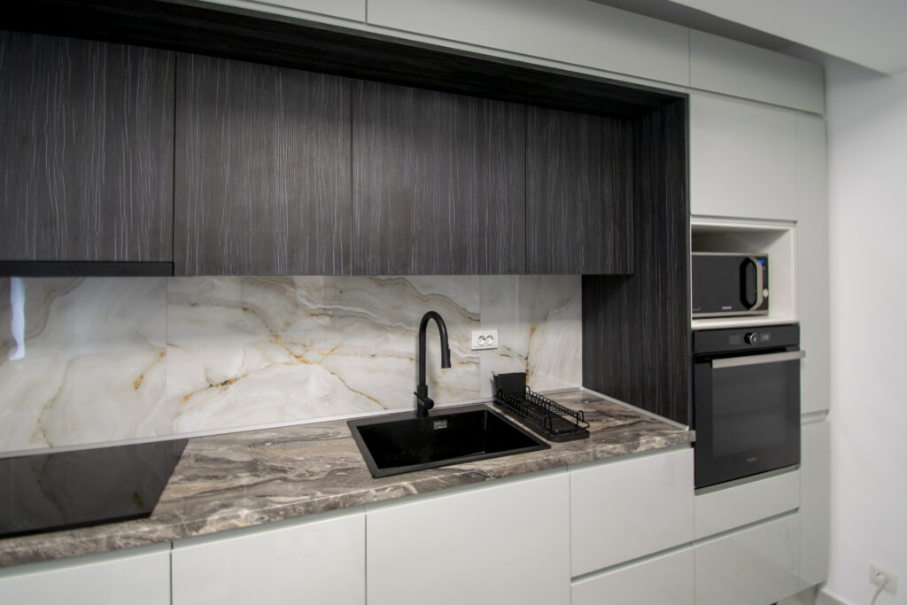 Blatul HPL compact este alegerea perfectă pentru durabilitate și rezistență în fața uzurii zilnice. De asemenea, acesta adaugă un aspect modern și curat, în timp ce plăcile laterale din același material oferă o continuitate vizuală și estetică în întreaga mobilă de bucătărie.