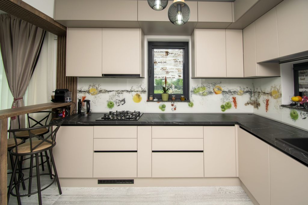 Pentru o notă artistică și unică, am ales un splashback de sticlă securizată printată. Imaginează-ți un design personalizat care îți reflectă stilul și personalitatea în timp ce protejează și facilitează curățarea bucătăriei tale.